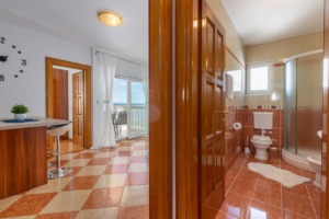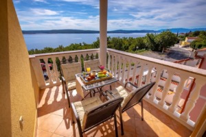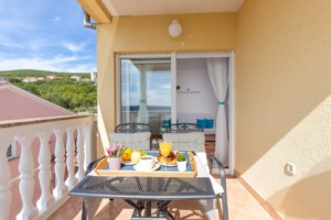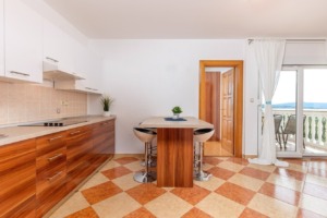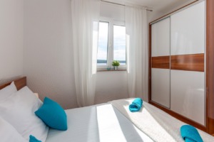 Apartman se nalazi na 2. katu i ima prekrasan pogled na more, sastoji se od 1 spavaće sobe, dnevni boravak i kuhinja su jedna prostorija koja ima izlaz na mali balkon gdje se nalazi stol sa stolicama za uživanje u pogledu na more. Apartman ima kupaonicu s tušem i perilicom rublja.