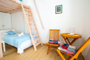 The cozy loft features a delightful combination of a double bed and a single bed, ensuring a restful night’s sleep after your exciting journeys.