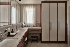 The bathrooms have a walk-in shower. The bathroom connected to the master bedroom includes a freestanding bathtub and dual washbasins.